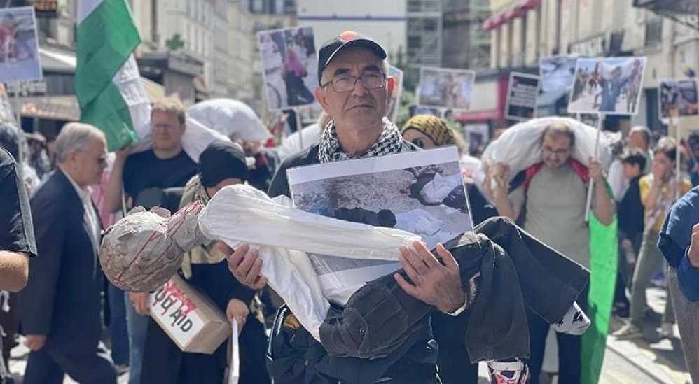 ونظم محتجون مسيرة في شارع "الشهداء" بالمنطقة التاسعة بباريس، رافعين بأيديهم أعلام فلسطين، ولافتات تطالب بإنهاء الإبادة والتجويع في غزة، وإدخال المساعدات الإنسانية للقطاع.