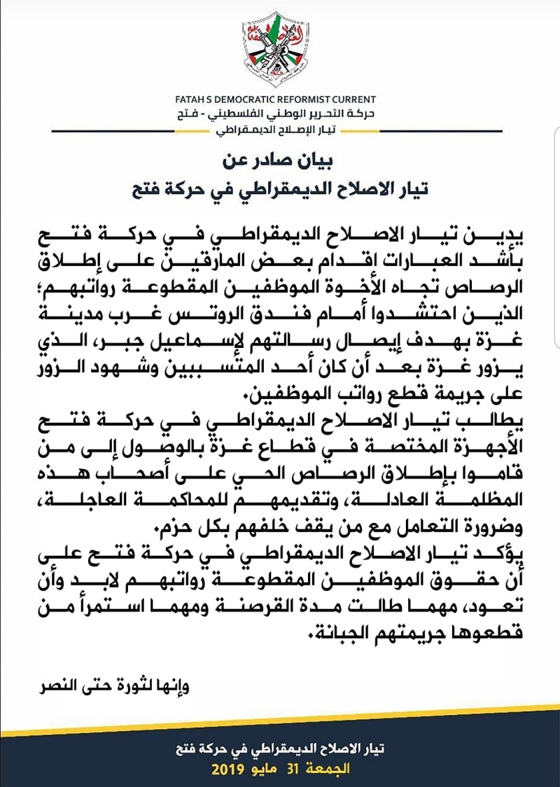 غزة|| أدان تيار الاصلاح الديمقراطي في حركة فتح، اليوم الجمعة، إقدام بعض المارقين على إطلاق الرصاص تجاه الموظفين المقطوعة رواتبهم.