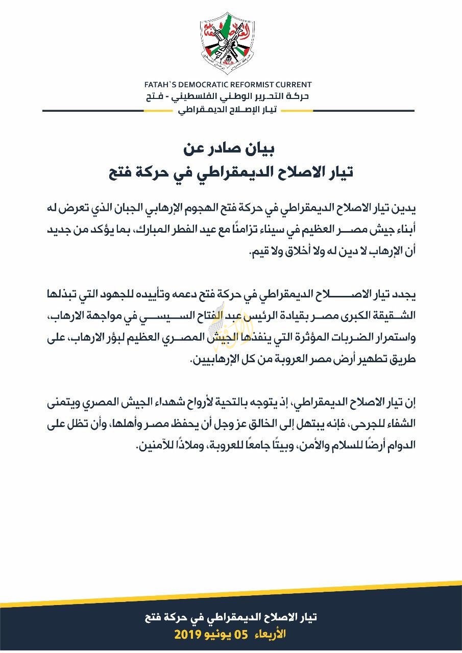 وجدد تيار الاصلاح الديمقراطي في حركة فتح دعمه وتأييده للجهود التي تبذلها الشقيقة الكبرى مصر بقيادة الرئيس عبد الفتاح السيسي في مواجهة الارهاب، واستمرار الضربات المؤثرة التي ينفذها الجيش المصري العظيم لبؤر الارهاب، على طريق تطهير أرض مصر العروبة من كل الإرهابيين.