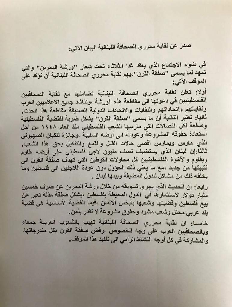 بيروت: أصدرت نقابة محرري الصحافة اللبنانية، بيانًا صحفيًا، اليوم الإثنين، أعلنت خلاله، رفضها للورشة الأمريكية في البحرين وصفقة القرن، معلنة تضامنها مع نقابة الصحفيين الفلسطينيين، داعية كل الإعلاميين العرب ونقاباتهم واتحاداتهم إلى مناهضة صفقة ترامب، ومقاطعة الورشة المزمع عقدها في البحرين غدًا وبعد غد.