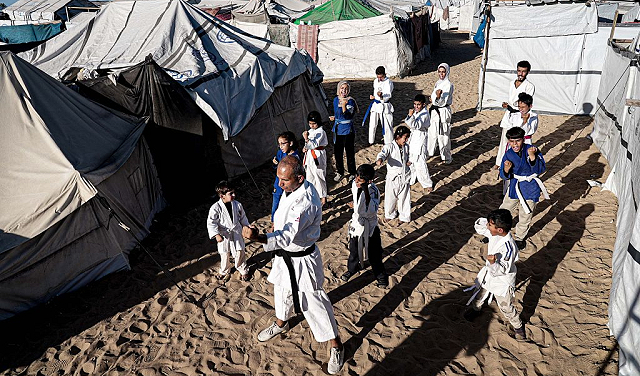 في مدينة خانيونس، يتدرّب فريق الكاراتيه في الممرّات بين خيام النازحين، حيث يقضي الأطفال أيامهم وسط آثار الدمار والنزوح، ويجدون في هذه التدريبات متنفسًا للحركة واستعادة شيء من حياتهم الطبيعيّة. وبإشراف المدرّب، يلتزم الأطفال بتمارين بدنيّة أساسيّة وتدريبات في الدفاع عن النفس، مع التركيز على اللياقة والانضباط، رغم غياب المعدّات والظروف القاسية.