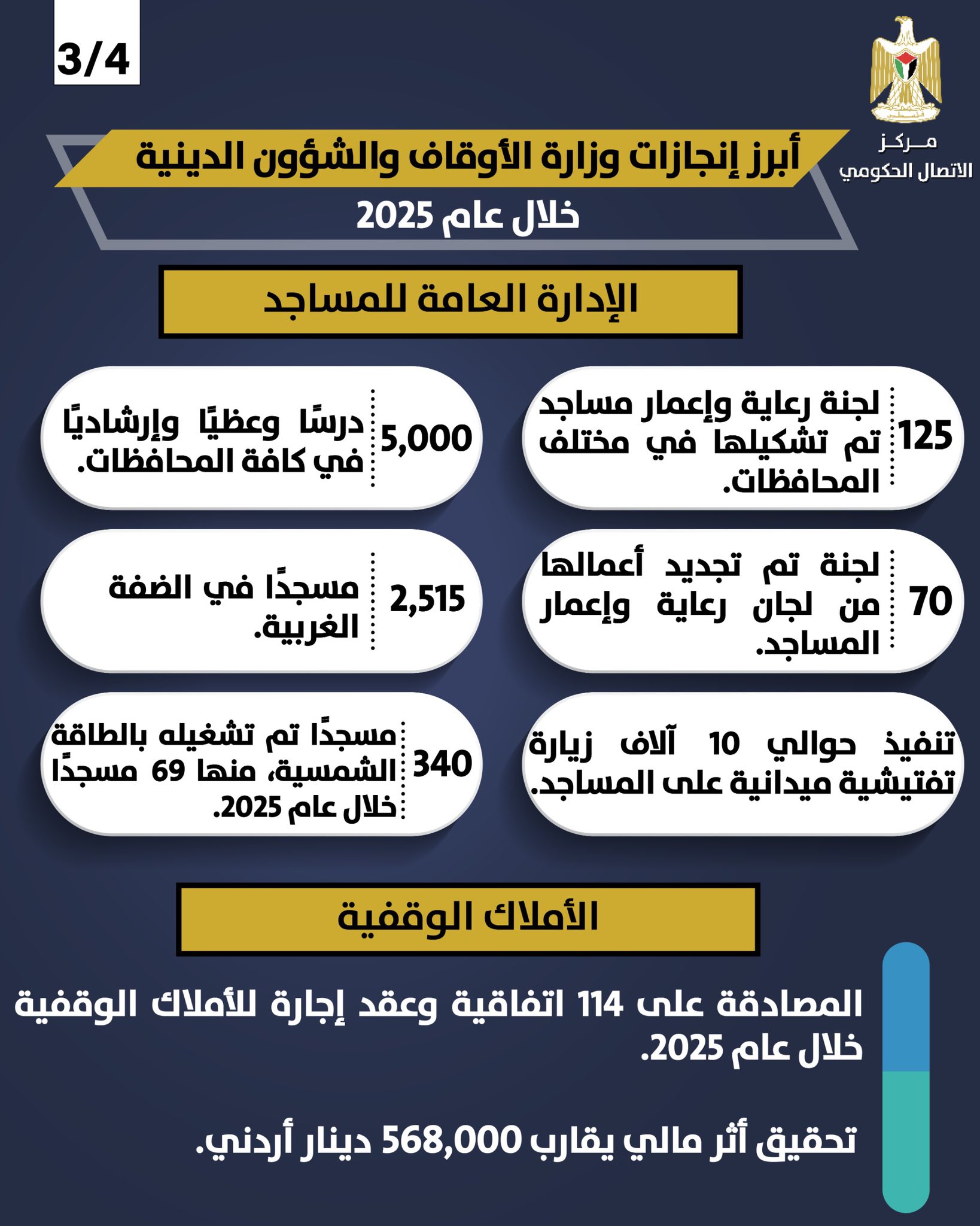 وفي قطاع الأوقاف، صادقت الوزارة على 114 اتفاقية وعقد إجارة خلال عام 2025، محققة عائدًا ماليًا يُقدّر بنحو 568 ألف دينار أردني، ضمن جهودها لتعظيم الاستفادة من الأملاك الوقفية وتعزيز مواردها.