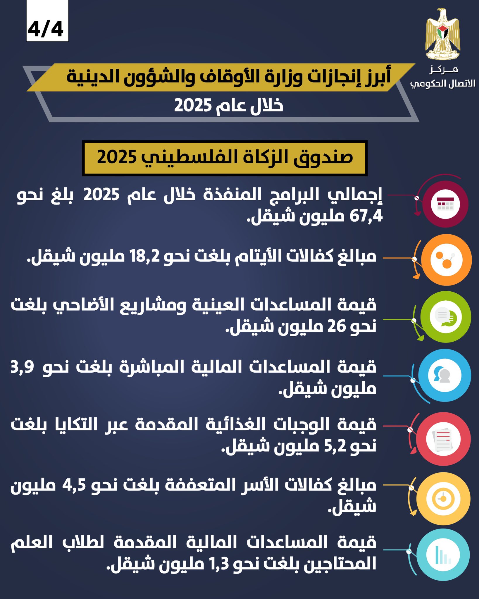 كما بلغت قيمة الوجبات الغذائية المقدمة عبر التكايا نحو 5.2 مليون شيقل، وكفالات الأسر المتعففة 4.5 مليون شيقل، فيما خُصص حوالي 1.3 مليون شيقل لدعم الطلبة المحتاجين.
