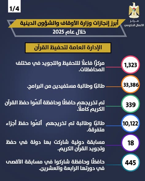 كما تم تخريج 339 حافظًا وحافظة أتمّوا حفظ القرآن الكريم كاملًا، إلى جانب 10,122 طالبًا وطالبة أنهوا حفظ أجزاء متفرقة. وعلى صعيد المشاركة الدولية، شاركت فلسطين في 18 مسابقة دولية، إضافة إلى تنظيم مسابقة الأقصى في دورتها الرابعة والعشرين بمشاركة 445 حافظًا وحافظة.