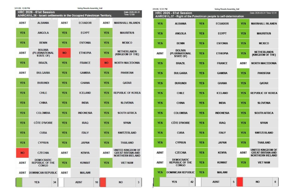 وصوتت (34) دولة لصالح قرار "المستوطنات الإسرائيلية في الأرض الفلسطينية المحتلة، بما فيها القدس الشرقية والجولان السوري المحتل" في حين صوتت (3) دول ضد القرار وامتنعت عن التصويت (10) دول. أما قرار "حق الشعب الفلسطيني في تقرير المصير"، فقد صوتت لصالحه (42) دولة، في حين امتنعت (5) دول عن التصويت.