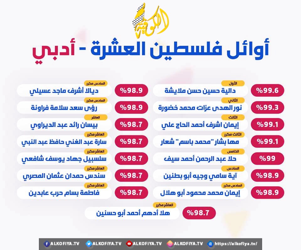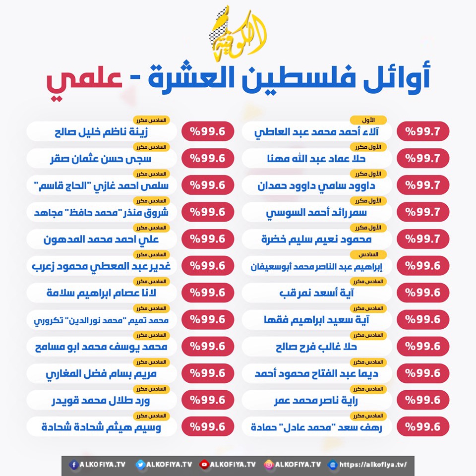 ويقدم موقع "الكوفية" التهنئة للناجحين، متمنياً لهم مزيداً من التقدم والعلم في خدمة وطنهم.
