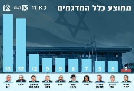 وحسب الاستطلاع الأولي للنتائج، فإن تحالف "أزرق أبيض" بقيادة رئيس الأركان الأسبق، بيني غانتس، حصل على 33 مقعدا من أصل 120، مقابل 32 لحزب "الليكود" الذي يقوده نتنياهو.
