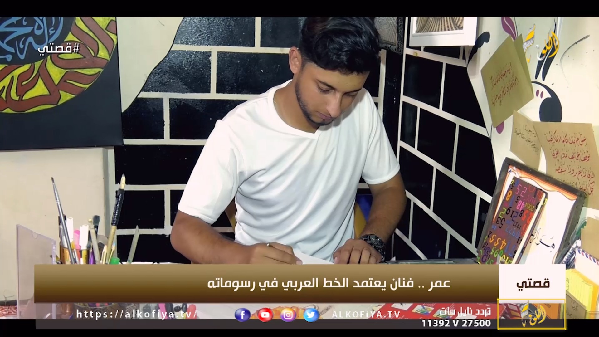 عمر أبو كوش فنان يعتمد الخط العربي في رسوماته