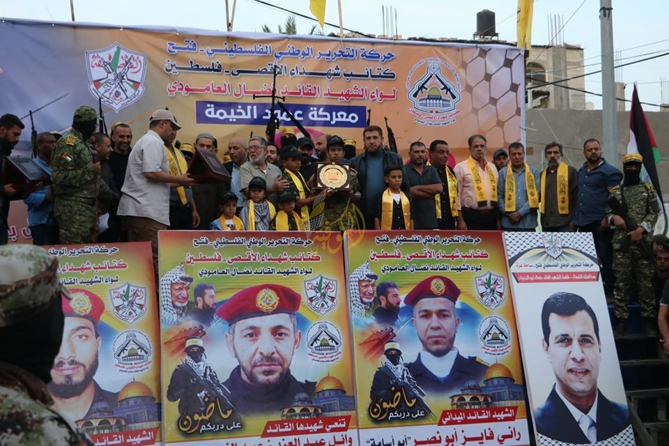 غزة: نظمت كتائب شهداء الأقصى - لواء الشهيد القائد "نضال العامودي"، الجناح العسكري لحركة فتح، اليوم الأحد، مهرجانا في محافظة شمال غزة، لتأبين شهدائها الأبطال، الشهيد وائل عبد النبي، الشهيد جهاد أبوخاطر، والشهيد رانى أبو النصر، الذين ارتقوا خلال تصديهم للعدوان الإسرائيلي على قطاع غزة.