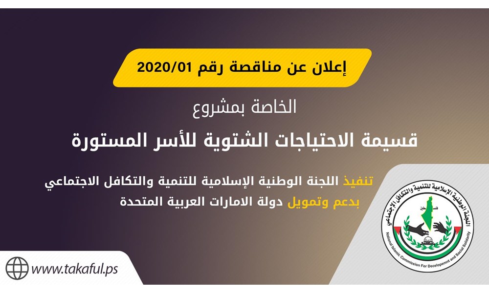 وأوضحت "تكافل"، أن "المناقصة تشمل إسطوانة غاز صغيرة مع قرص تدفئة، وبطانية شتوية، ونايلون لتغطية أسطح المنازل، وتعبئة أسطوانات غاز، وفرشة إسفنج مع وجه"، مشيرة إلى أنه "يمكن لأصحاب التجارة العامة والمولات والمحلات التجارية الكبيرة التقدم للمناقصة، من خلال الحصول على صحيفة الشروط والمواصفات من مقر اللجنة الكائن في شارع البحر- خلف اللايت هاوس (فيلا عاشور)، وذلك لقاء مبلغ 100 دولار غير مستردة خلال الفترة من الساعة الواحدة ظهراً وحتى الثالثة بعد الظهر يوميا، عدا يوم الجمعة".