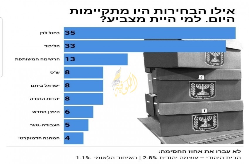 وبحسب موقع "والا" العبري، الذي أجرى الاستطلاع ونشره صباح اليوم الخميس، فإن حزب "كحول لفان" حصل على 35 مقعدا، بينما حزب الليكود حصل على 33 مقعدا فقط، والقائمة العربية 13 مقعدا، و8 مقاعد لكل من "يسرائيل بيتنا"، و"شاس"، و"يهدوت هتوراة،" ويحصل "اليمين الجديد" على 6 مقاعد، وتحالف العمل جيشر على 5 مقاعد، والمعسكر الديمقراطي على 4 مقاعد، ومعسكر اليسار على 57 مقعدا، مقابل حصول معسكر اليمين حرديم، على 55 مقعدا بالكنيست القادمة.