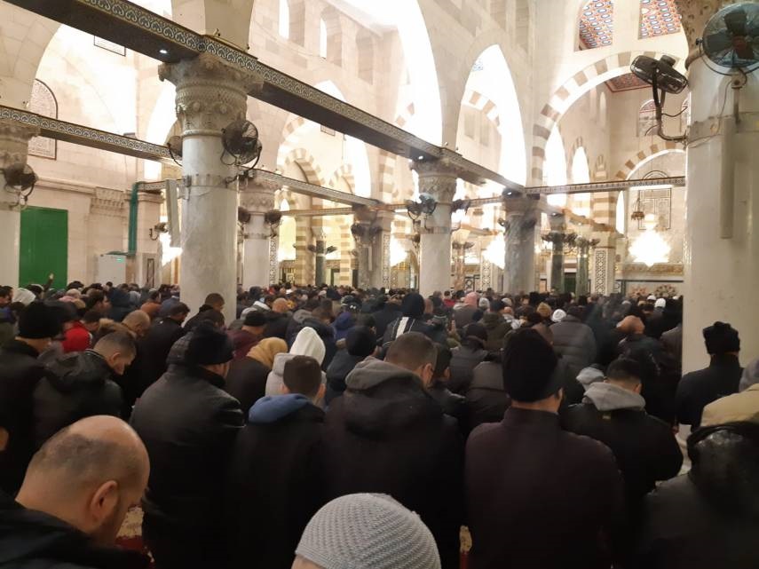 وشارك في أداء صلاة الفجر في مصليات المسجد آلاف المصلين الذين توافدوا من كافة أحياء وضواحي القدس، رغم الأجواء الباردة وهطول الأمطار.