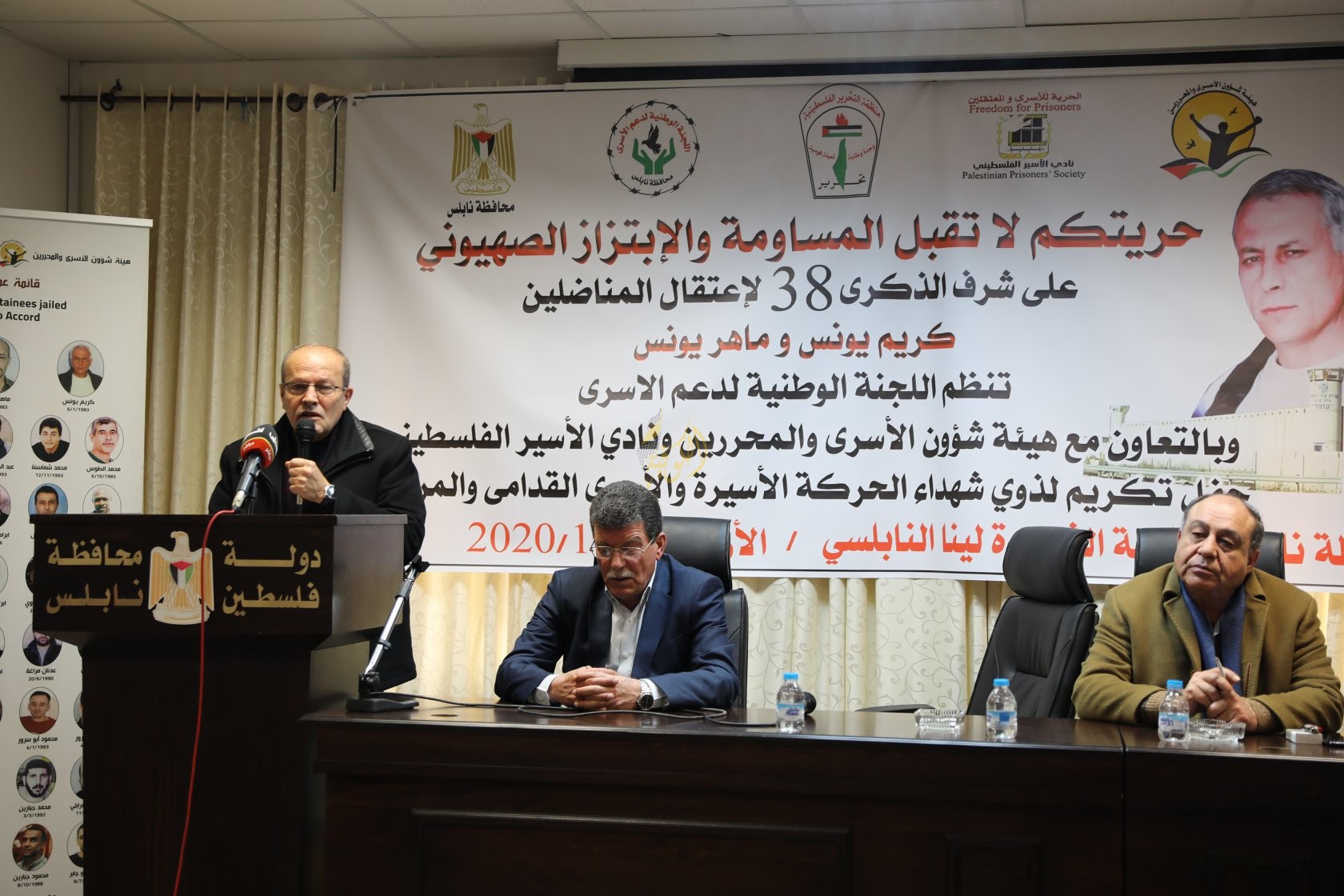 ويأتي حفل التكريم هذا بمناسبة مرور 38 عاماً على اعتقال الأسيرين كريم يونس وماهر يونس، حيث أقيم الحفل في مقر محافظة نابلس، بحضور رئيس هيئة شؤون الأسرى والمحررين اللواء قدري أبو بكر، وأمين سر حركة فتح إقليم نابلس جهاد رمضان، ومدير نادي الأسير قدورة فارس، وأهالي الشهداء والأسرى، وممثلي الفعاليات والمؤسسات في المحافظة.
