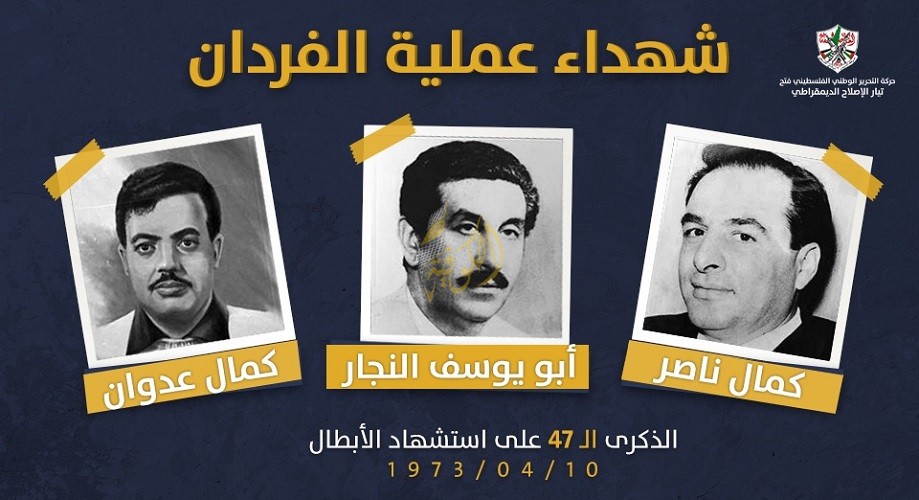 القدس المحتلة: سلّطَ نشطاء فلسطينيون على مواقع التواصل الاجتماعي "تويتر" وفيسبوك، الضوء على الذكرى السابعة والأربعين لاغتيال ثلاثة من كبار قيادات حركة فتح والجنة المركزية، وهم: "كمال عدوان وكمال ناصر ومحمد يوسف النجار"، الذين يُصادف ذكرى استشهادهم اليوم الجمعة العاشر من نيسان.
