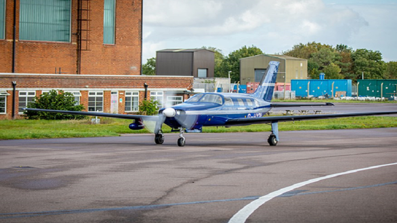 وأقلعت الطائرة، التي تتسع لـ 6 أفراد، والمسماة "بايبر إم- كلاس"، من مطار كرانفيلد، والذي يحتوي على مرفق البحث والتطوير التابع لشركة زيرو افيا.