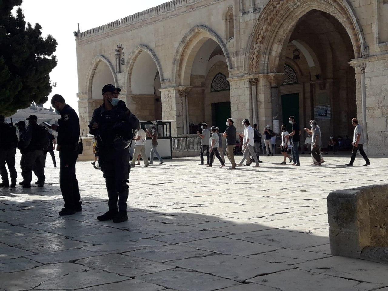 ووفرت شرطة الاحتلال، الحماية الكاملة للمستوطنين أثناء دخولهم عبر باب المغاربة، وتجولهم في ساحات المسجد الأقصى وانتهاءً بخروجهم من باب السلسلة.