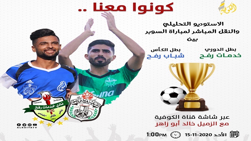 غزة: تنقل قناة "الكوفية" لقاء كأس السوير بين فريقي خدمات رفح وشباب رفح على الهواء مباشرة، غداً الأحد، في تمام الساعة الثانية ظهراً، على أن يسبقه الاستوديو التحليلي للمبارة، في الواحدة ظهرا.