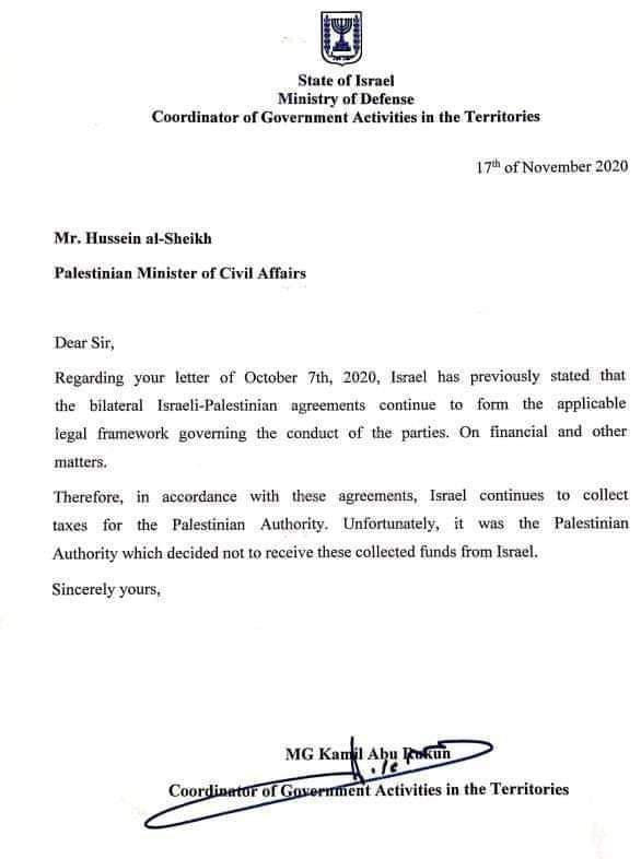 سيدي العزيز ، بخصوص رسالتك المؤرخة في 7 أكتوبر 2020، ذكرت إسرائيل سابقًا أن العلاقات الثنائية الإسرائيلية-الفلسطينية والاتفاقات تستمر في تشكيل الإطار القانوني المطبق الذي يحكم سلوك الأطراف. في الأمور المالية وغيرها.