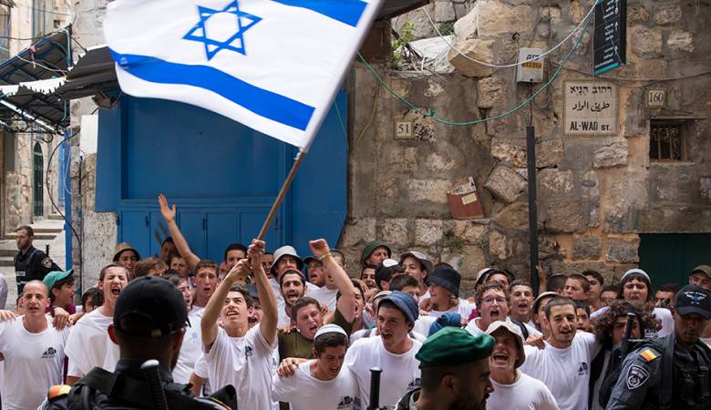 القدس المحتلة: صعّدت عصابات المستوطنين ممارساتها وعربداتها ونظمت، الليلة الماضية، ولأول مرة منذ احتلال البلدة عام 1967 احتفالاً خاصاً وسط شارع الواد، المُمتد من باب العمود والمُفضي الى أبواب المسجد الأقصى وحارات وأسواق القديمة، تخلله رقصات استفزازية وهتافات عنصرية ضد العرب والفلسطينيين، ودعوات لبناء الهيكل مكان الأقصى وغيرها.