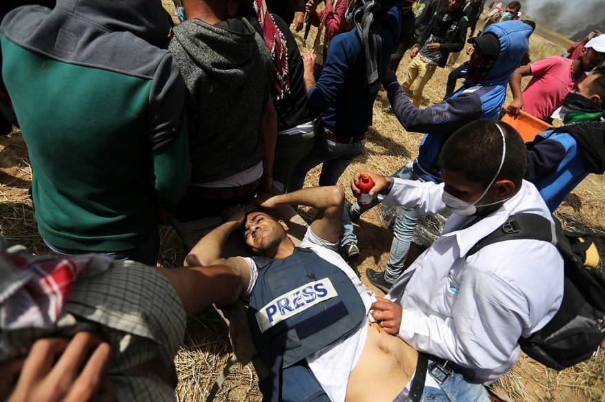 28-9-2018:جيش الاحتلال يستهدف الجموع الصحفية التي تغطي مسيرات العودة في قطاع غزة ويوقع بهم الإصابات، وعرف منهم :الصحفية حنين بارود أصيبت بقنبلة غاز مباشرة في رأسها ، المصور الصحفي محمد أبو قادوس في يديه ، الصحفي أمجد جرادة بشظايا في قدمه ويده وبالاختناق نتيجة استنشاقه قنابل الغاز المسيل للدموع ، الصحفي محمود عبد العال نتيجة استنشاقه قنابل الغاز والصحفي احمد حسونة أصيب أيضا نتيجة استنشاق الغاز، الصحفي معين الضبة من وكالة خبر للأنباء الفلسطينية أصيب بقنبلة غاز في كتفه، طالب الإعلام علاء النمر أصيب بقنبلة غاز في ظهره.