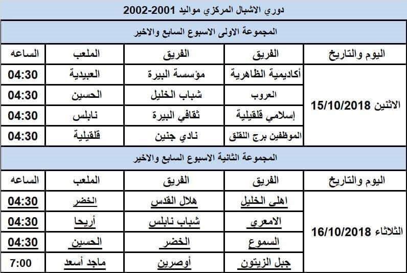 القدس المحتلة: أعلنت لجنة المسابقات في اتحاد كرة القدم جدول مباريات الأسبوع السابع والأخير من الدوري المركزي لمواليد 2001/2002 كما هو مبين: