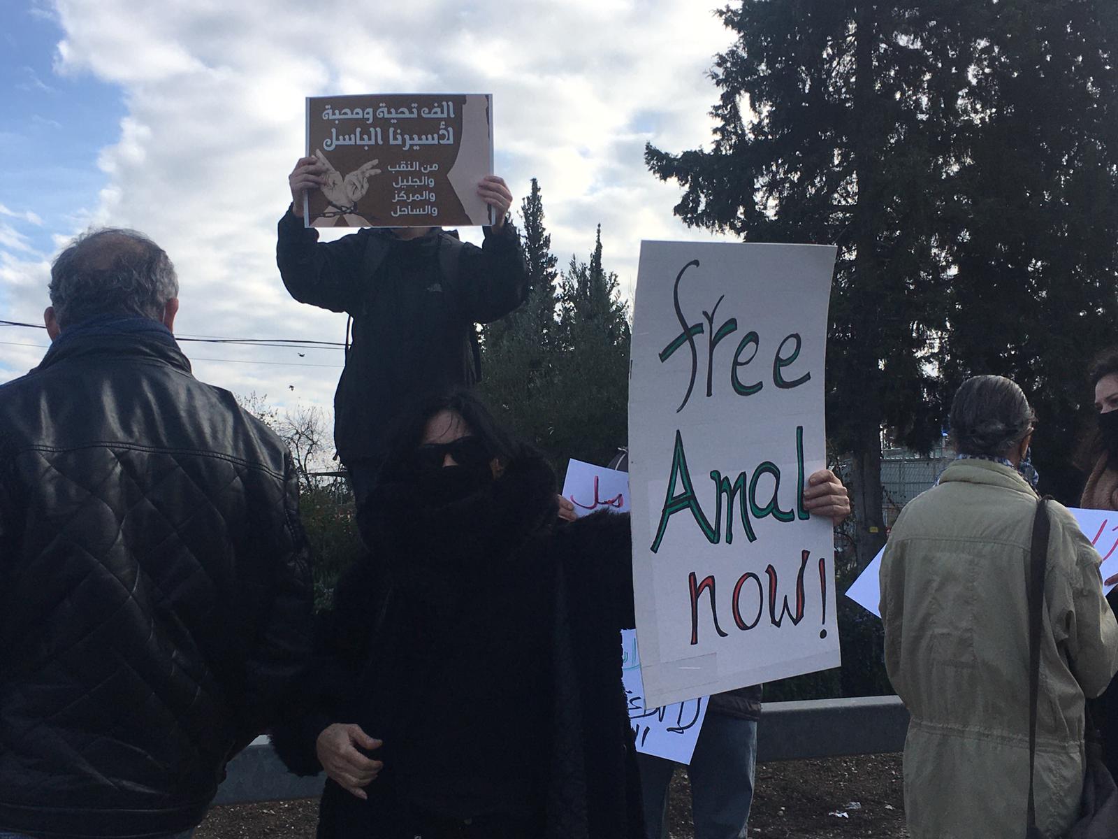 ورفع المشاركون في المظاهرة، لافتات تطالب بوقف الاعتقال الإداري، وإطلاق سراح أمل فورا، منها "أطلقوا سراح أمل الآن، الحرية لأمل، أوقفوا الاعتقال الإداري، ألف تحية لأسيرنا الباسل والبطل".