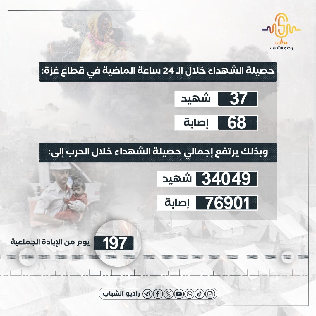 وأضافت أن الاحتلال ارتكب 4 مجازر خلال الساعات الـ24 الماضية راح ضحيتها 37 شهيدا و68 اصابة.